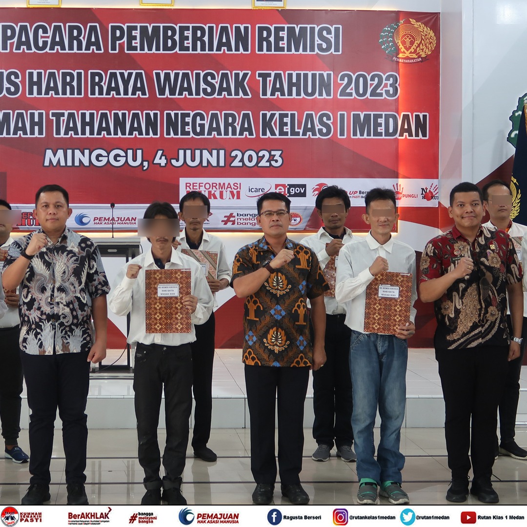 Sebanyak 21 (dua puluh satu) orang Warga Binaan Pemasyarakatan Rutan Kelas I Medan Kanwil Kemenkumham Sumut mendapatkan Remisi Khusus Hari Raya Waisak 2023, Bertempat Di Aula Saharjo. Minggu (04/06/2023)