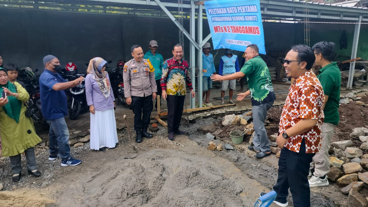 Kepala Sekolah Sekolah MTSN 2 Tanggamus Nurzaman S.Ag. Mpdi. Beserta Ketua Komite Aria Genta SH. dan Anggota pengurus Komite Sekolah serta Wali murid melaksanakan kegiatan peletakan batu pertama untuk pembangunan gedung Komite yang bertempat di MTSN 2 Tanggamus, Sabtu ( 1 / 04 /2023 ).