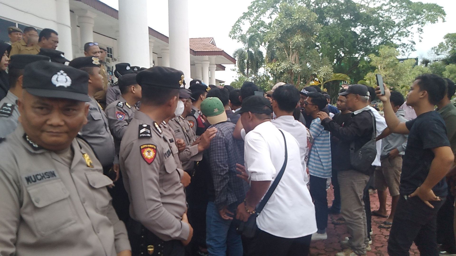 Karena tidak percaya Bupati  Asahan tidak berada ditempat,Aliansi Masyarakat Kecamatan Air Joman ingin melakukan sweeping kedalam kantor Bupati Asahan tapi dihalangi Personil Polisi dari Polres Asahan dan Satpol-PP,karena massa memaksa terus untuk melakukan sweeping maka terjadilah aksi dorong-dorongan antara pendemo dan petugas,IPTU.Arbin Rambe coba mengingatkan agar jangan sempat terjadi yang tak diinginkan karena melihat pendemo terus memaksa untuk melakukan sweeping kedalam Kantor Bupati.