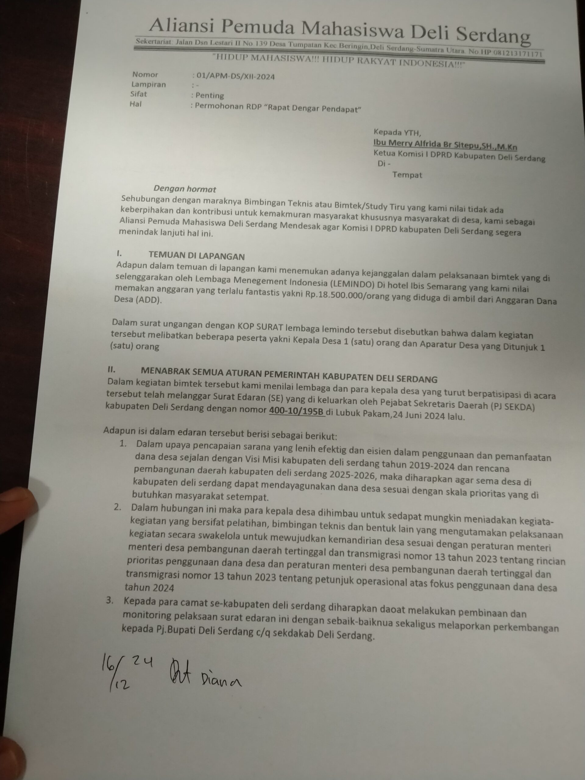 Seluruh unsur mahasiswa yang tergabung dalam Aliansi Pemuda Mahasiswa Deli Serdang ramai mendatangi kantor DPRD Kabupaten Deli Serdang guna mendesak agar Komisi 1 segera membongkar dan memanggil para mafia bimbingan teknis (BIMTEK) beserta instansi terkait.