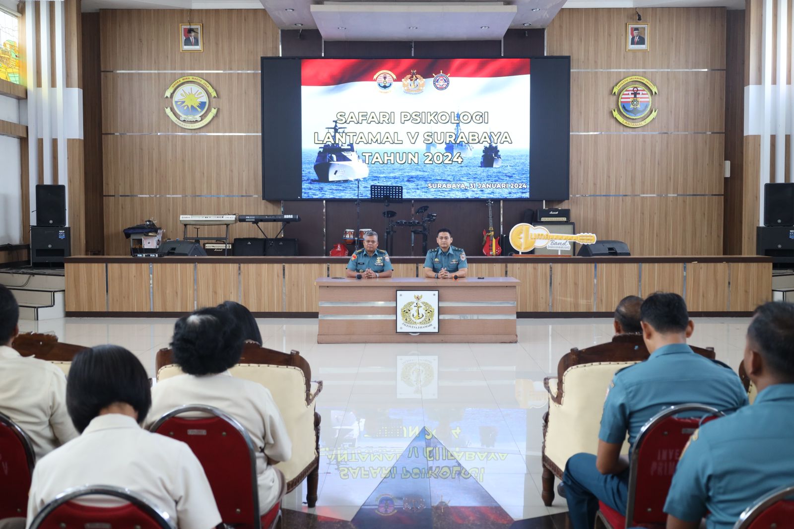 Guna meningkatkan Wawasan Psikologi, Prajurit Pangkalan Utama TNI AL (Lantamal) V menerima pembekalan dari tim Safari Psikologi dari Dinas Psikologi TNI AL (Dispsial) yang dilaksanakan di Gedung Serbaguna Mako Lantamal V, Perak, Surabaya. Rabu (31/01/2024)