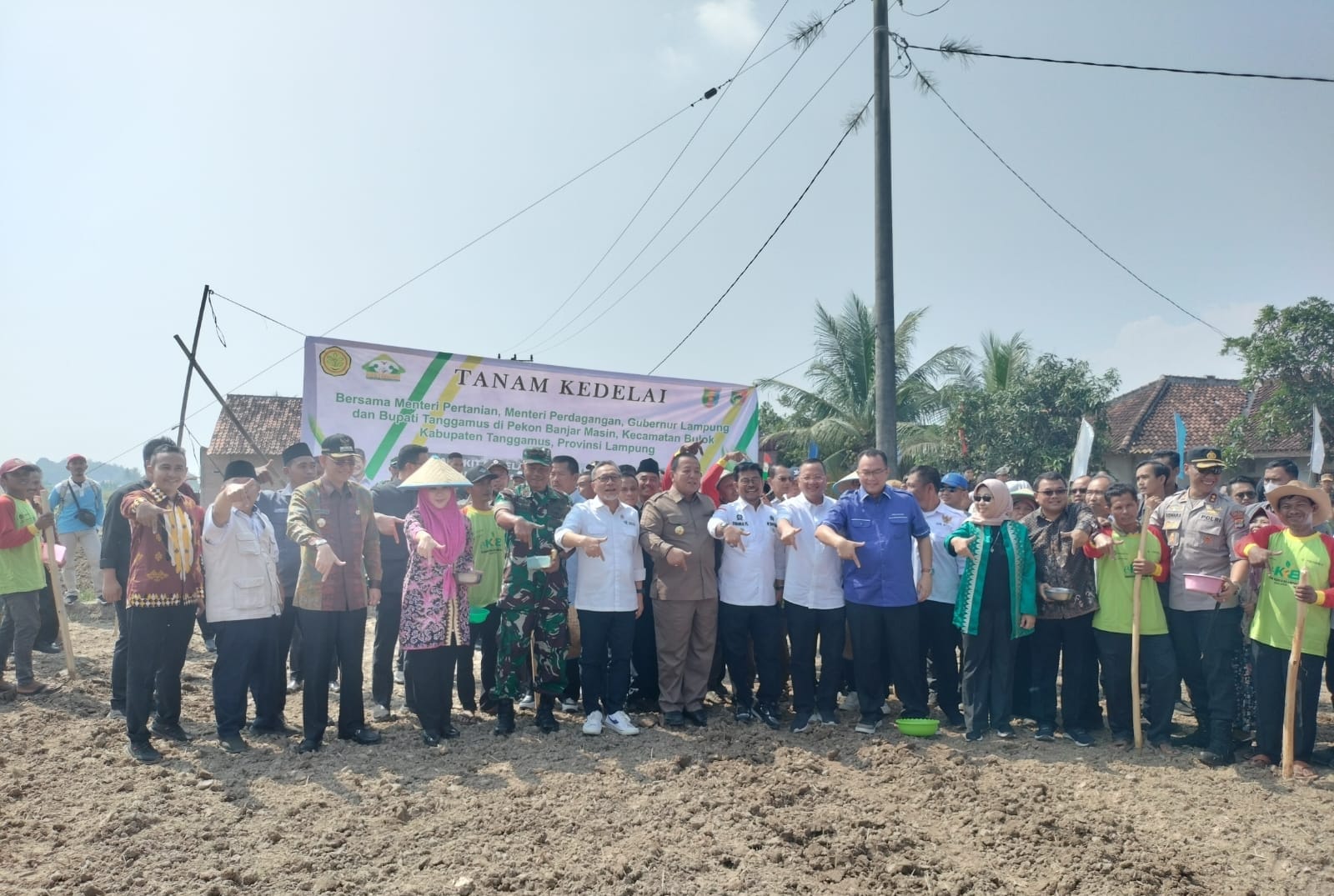 Tampak dalam penanaman kedelai tersebut, Bupati Tanggamus Hj. Dewi Handajani mendampingi rombongan, Menteri Pertanian Republik Indonesia, Syahrul Yasin Limpo dan Menteri Perdagangan, Zulkifli Hasan serta Ketua Komisi IV DPR RI, Sudin dan Gubernur Lampung, Arinal Junaidi serta di dampingi para petani dari kelompok tani umbul solo.