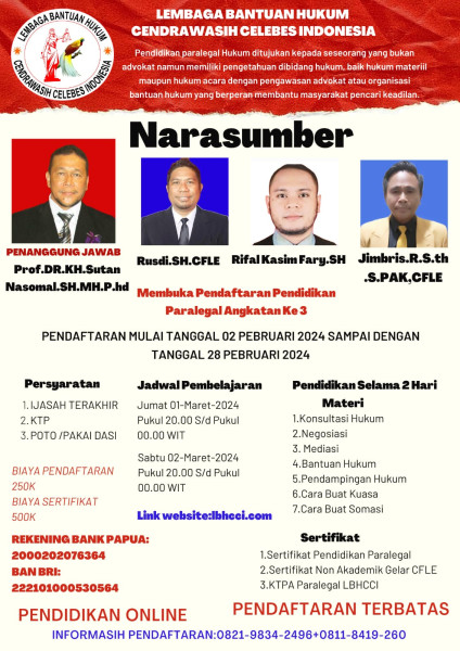 Lembaga Bantuan Hukum (LBH) Cenderawasih Indonesia membuka pendaftaran Pendidiknan Paralegal Angkatan ke 3 pada tanggal 02 Februari β 28 Februari 2024.