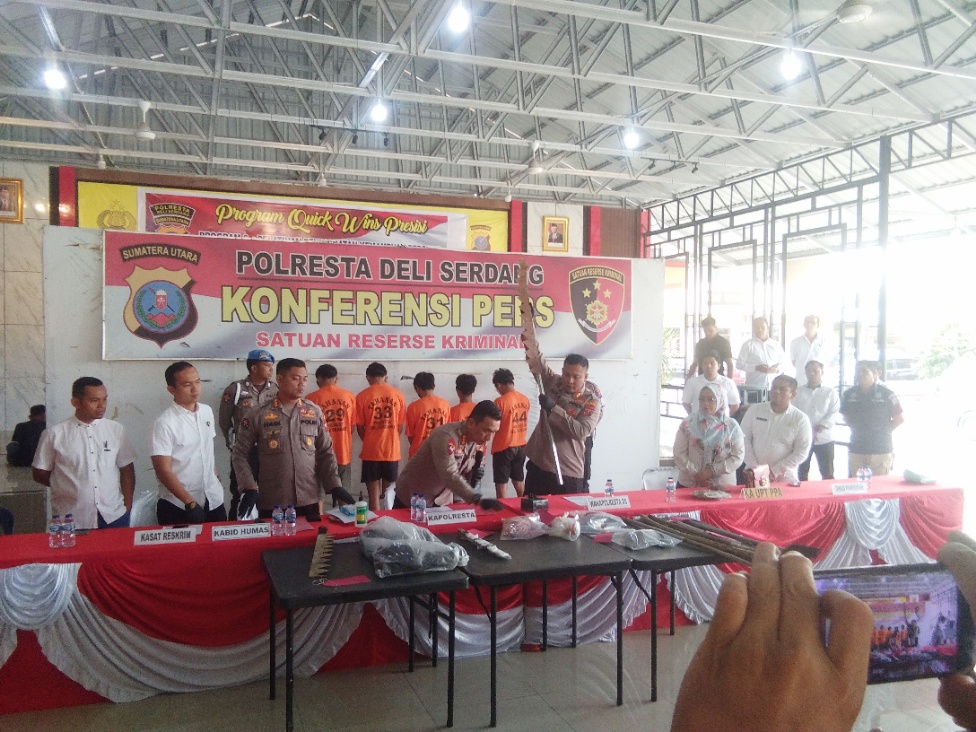 Kapolresta Deli Serdang Kombes Pol Irsan Sinuhaji adakan Press Release kasus Tawuran warga yang mengakibatkan 1 orang meninggal dunia yang dilaksanakan di Aula terbuka Mapolresta Deli Serdang, Rabu (15/02/2023).