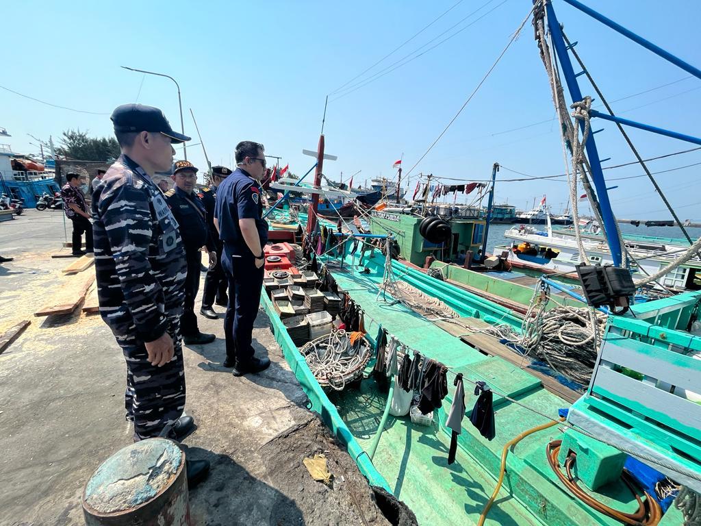 Komandan Pangkalan TNI AL (Danlanal) Banyuwangi Letkol Laut (P) Indra Nusha R, yang diwakili Komandan Pos Keamanan Laut Terpadu (Danposkamladu) Mayangan Letda Laut (E) Warwo mendampingi kunjungan kerja Direktur Jenderal Pengawasan Sumber Daya Kelautan dan Perikanan (PSDKP) Laksamana Muda TNI Adin Nurawaluddin, M. Han., di Pelabuhan Perikanan Pantai Mayangan Kota Probolinggo. Jumat (27/10/2023).
