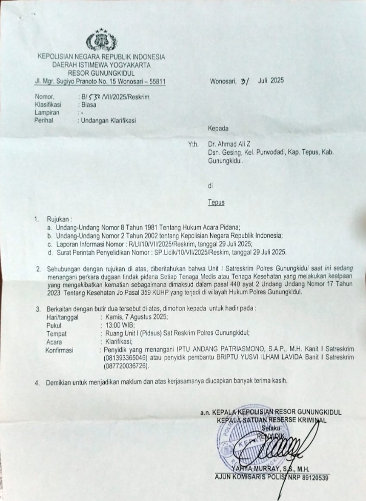“Surat pemanggilan dr. AA sudah dikirimkan, untuk dimintai hadir pada Kamis 7 Agustus 2025 untuk klarifikasi di ruang Unit Pidsus Satreskrim Polres Gunungkidul,”tambahnya.
