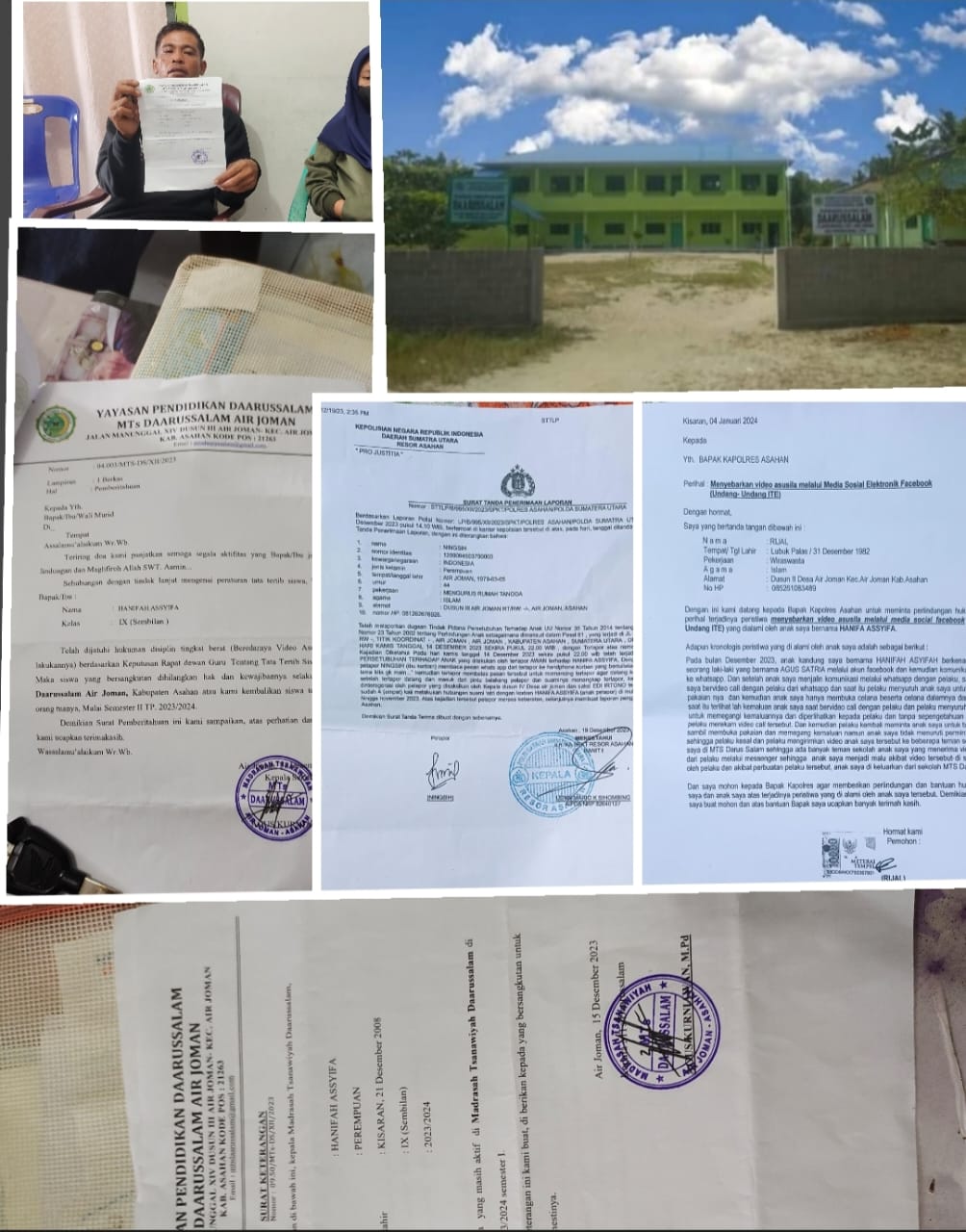Kemudian, perihal tersebut sudah kami laporkan ke Polres Asahan ada dua bentuk laporan. Dalam laporan istri saya dengan Nomor: STPL/B/995/XII/2023/SPKT/Polres Asahan/Polda Sumatera Utara dan laporan saya dalam bentuk Pengaduan Masyarakat (Dumas) penyebaran video asusila melalui media elektronik Facebook (UU ITE) dengan pelaku atas nama Agus Satria warga Kelurahan Binjai Seberangan Kecamatan Air Joman. Saya berharap kepada pihak institusi penegak hukum terkhusus Polres Asahan untuk segera menangkap kedua pelaku yang sudah melakukan tindakan yang tidak pantas tersebut, Dan saya memohon kepada Kakan Kemenag Kabupaten Asahan untuk memberi kesempatan kepada putri saya untuk dapat menyelesaikan sekolahnya yang terhitung hanya 4 bulan lagi.”, Cetusnya.