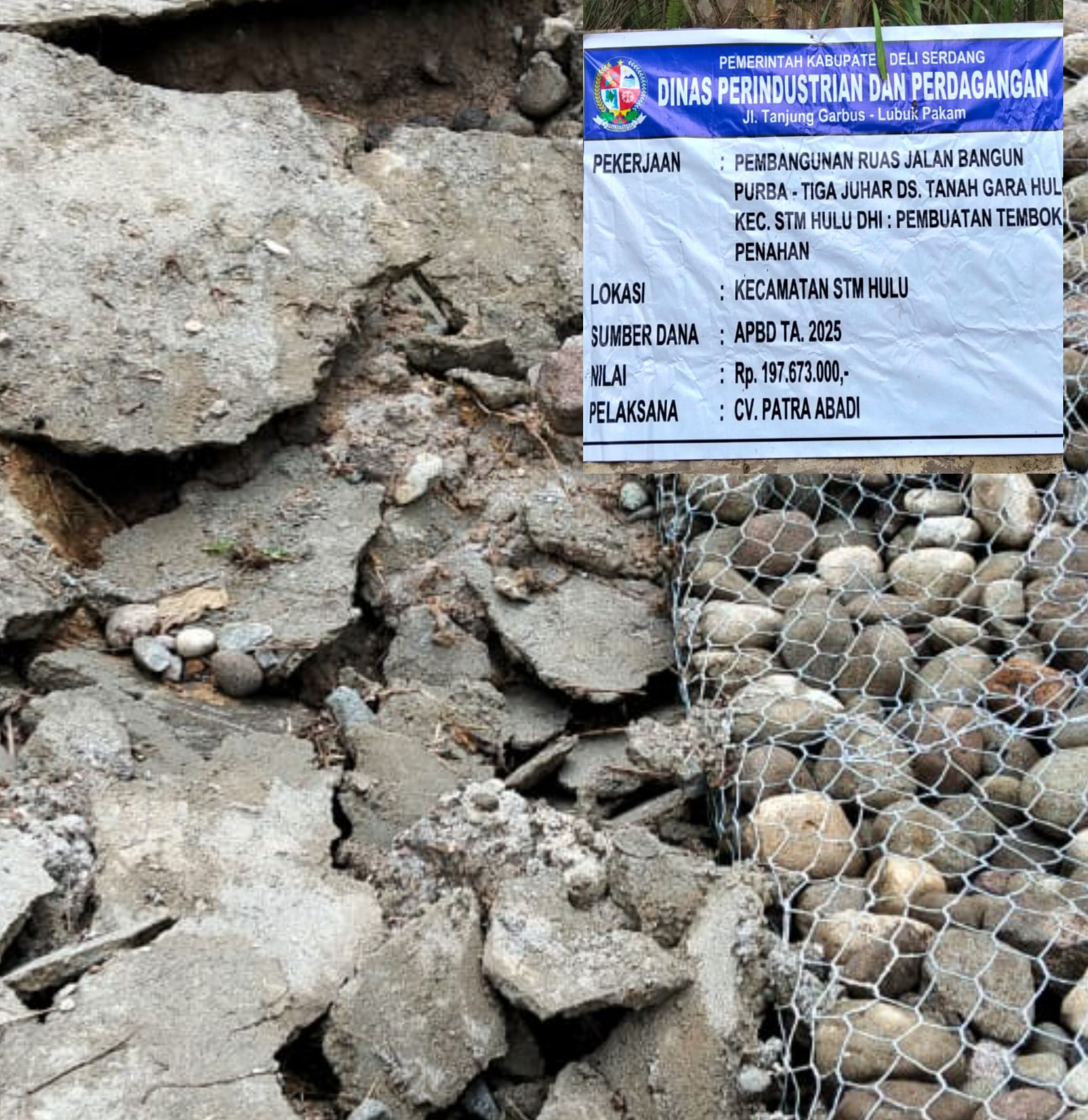 STM hulu | TambunPos.com -Proyek pembuatan Bronjong di ruas jalan Bangun Purba- Tiga Juhar di Desa Tanah Gara Hulu, ambles meski baru selesai dikerjakan pada akhir bulan Desember 2025.