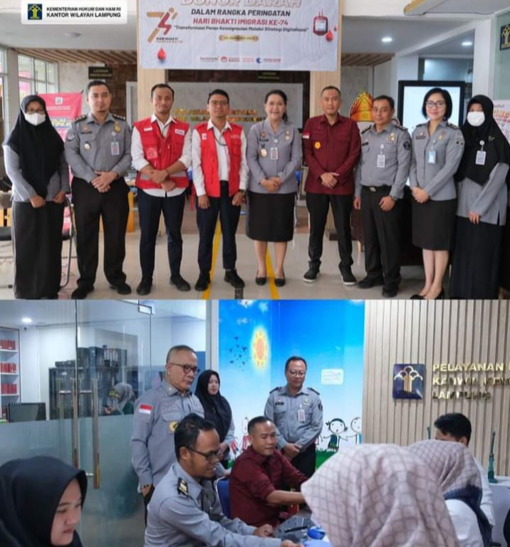 Semangat berbagi di Hari Bhakti Imigrasi yang mengambil tema “Transformasi Peran Keimigrasian Melalui Strategi Digitalisas” pada hari ini berkerja sama dengan UPTD PMI Provinsi Lampung yang dihadiri oleh Enam orang tim petugas tenaga kesehatan dan didampingi oleh Dokter Madya Kanwil Lampung dr. Nathalia Christina Simanungkalit.