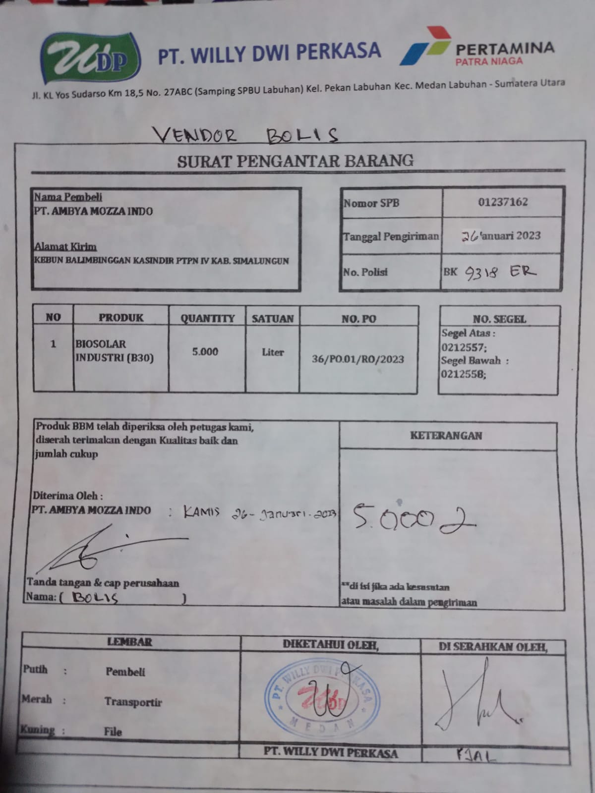 Sesuai hasil pengecekan, kata Lubis, asal usul minyak sah dan tidak ilegal karena memiliki dokumen resmi dari PT Willy Dwi Perkasa dan diterima rekanan PTPN IV PT Ambya Mozza Indo. “Bbm jenis solar yang disimpan dalam tangki fiber saat ini di wilayah Kasindir dilengkapi dokumen BBM non subsidi” ujar Lubis (29/1)