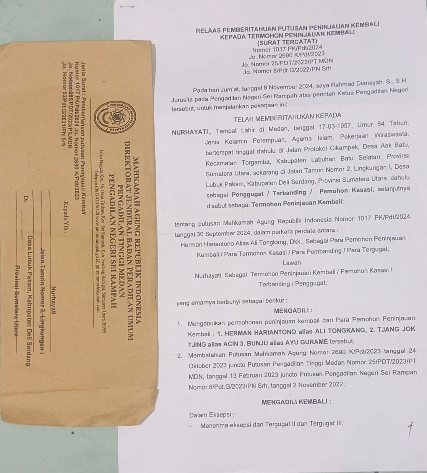Terkait Relaas pemberitahuan putusan Peninjauan Kembali (PK) kepada termohon PK dengan nomor Perkara 1017 PK/Pdt/2024 jo.Nomor 2690 K/Pdt/2023 Jo.Nomor 25/PDT/2023/PT MDN dan Jo.Nomor 8/Pdt.G/2022/PN Srh Atas Gugatan 3 Objek Perkara di Lahan 64 Ha Dusun IV Desa Kota Galuh, Kecamatan Perbaungan, Serdang Bedagai, Sumut Milik Nirhayati, yang diserahkan Rahmad Diansyah.S,SH selaku jurusita atas perintah Ketua PN. Sei Rampah kepada Termohon Nurhayati pada tanggal 8 November 2024 lalu, mulai tercium adanya gelagat tentang terjadinya dugaan pemalsuan putusan PK yang disebutkan mengabulkan permohonan PK dari para Pemohon PK, Herman Hariantono Alias Ali Tongkang, Tjang Jok Tjing Alias Acin dan Bunju alias Ayu Gurame.