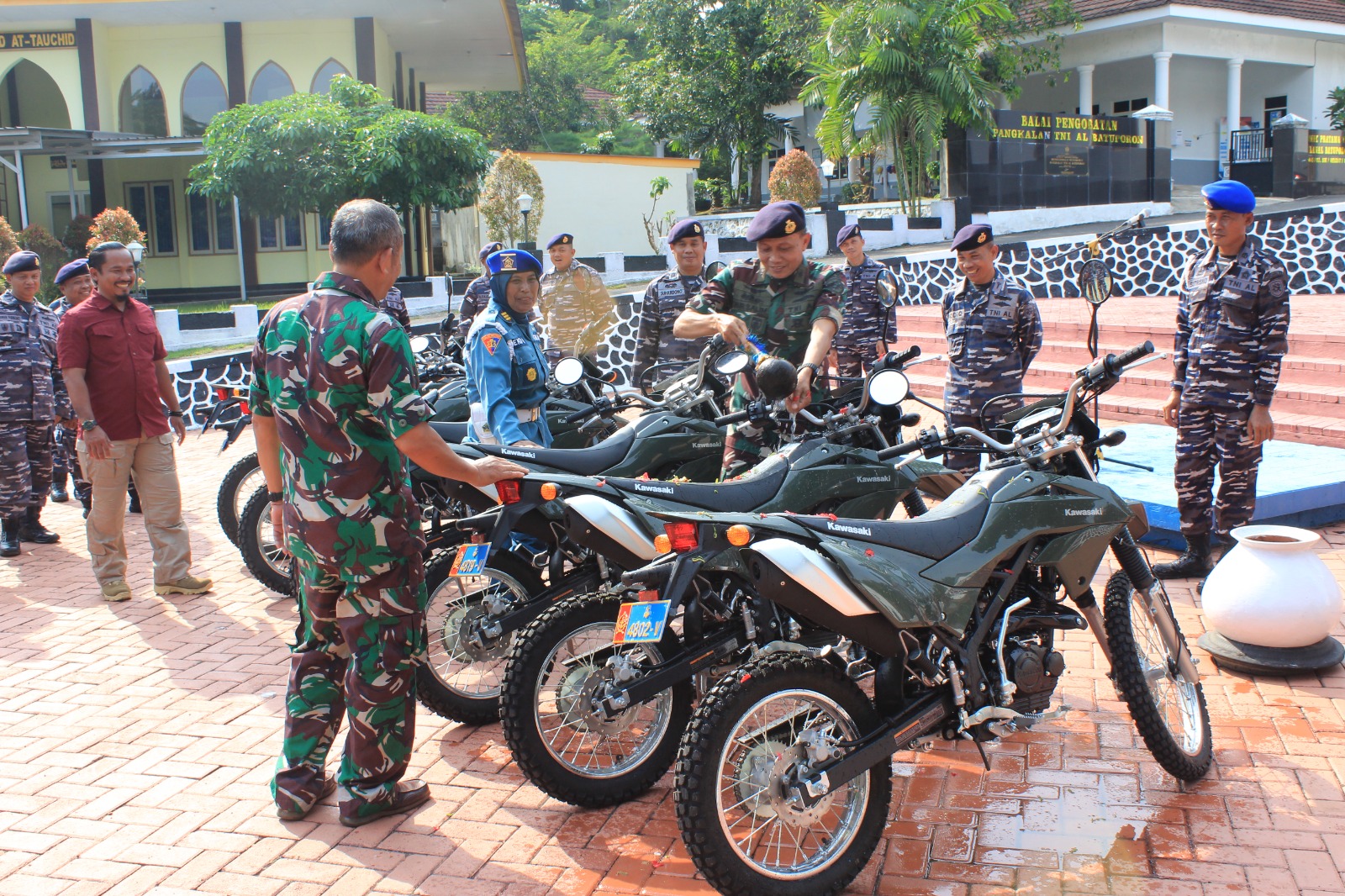 Komandan Pangkalan TNI AL (Danlanal) Batuporon Letkol Laut (P) Imam Ibnu Hajar, S. E., M. Tr. Opsla., mengawali prosesi pemandian bunga dan ucapan rasa syukur untuk enam unit kendaraan dinas sepeda motor Kawasaki KLX dari Kementrian Pertahanan Republik Indonesia untuk memperkuat serta mendukung kinerja prajurit, Lanal Batuporon. (20/02/2024).