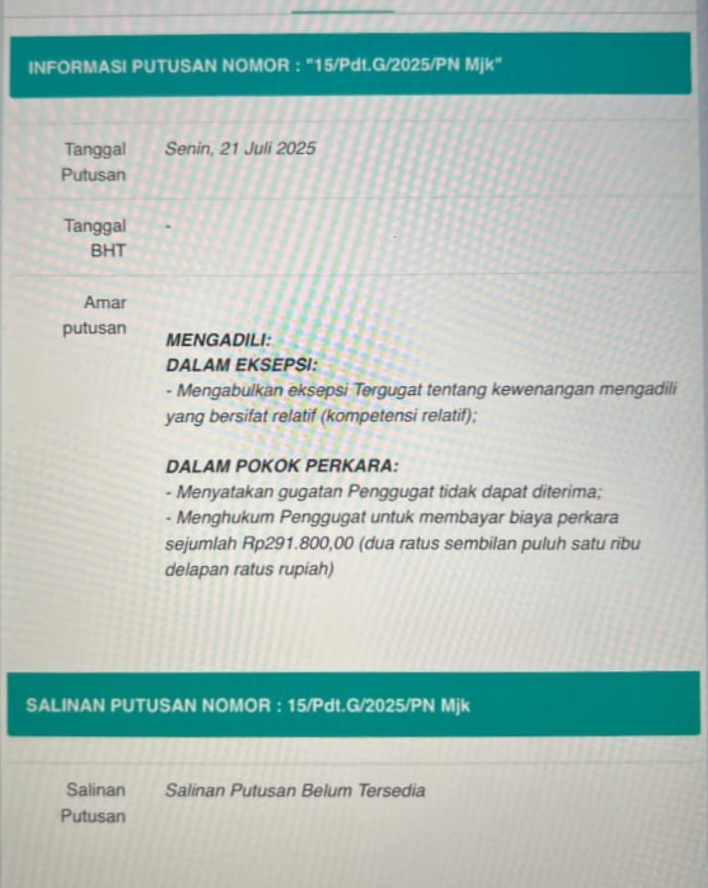 “Perkara kita menang, Pak. Gugatan PT SCA tidak diterima,” ujar Afiffatah, SH., kuasa hukum tergugat, melalui pesan singkat pada Senin (21/7/2025). Ia menegaskan bahwa perjuangan panjang dalam mencari keadilan akhirnya membuahkan hasil.