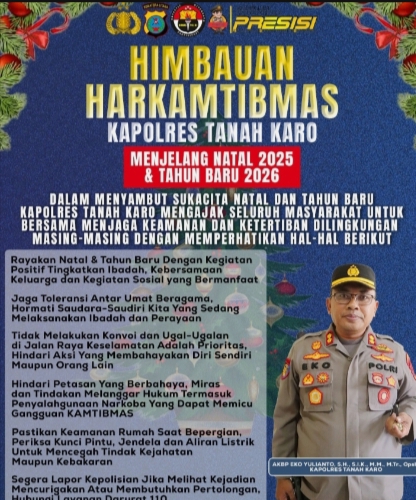TANAH KARO I TambunPos.com – Dalam menyambut sukacita Natal dan Tahun Baru, Kapolres Tanah Karo mengajak seluruh masyarakat untuk bersama menjaga keamanan dan ketertiban di lingkungan masing-masing dengan memperhatikan hal-hal berikut: