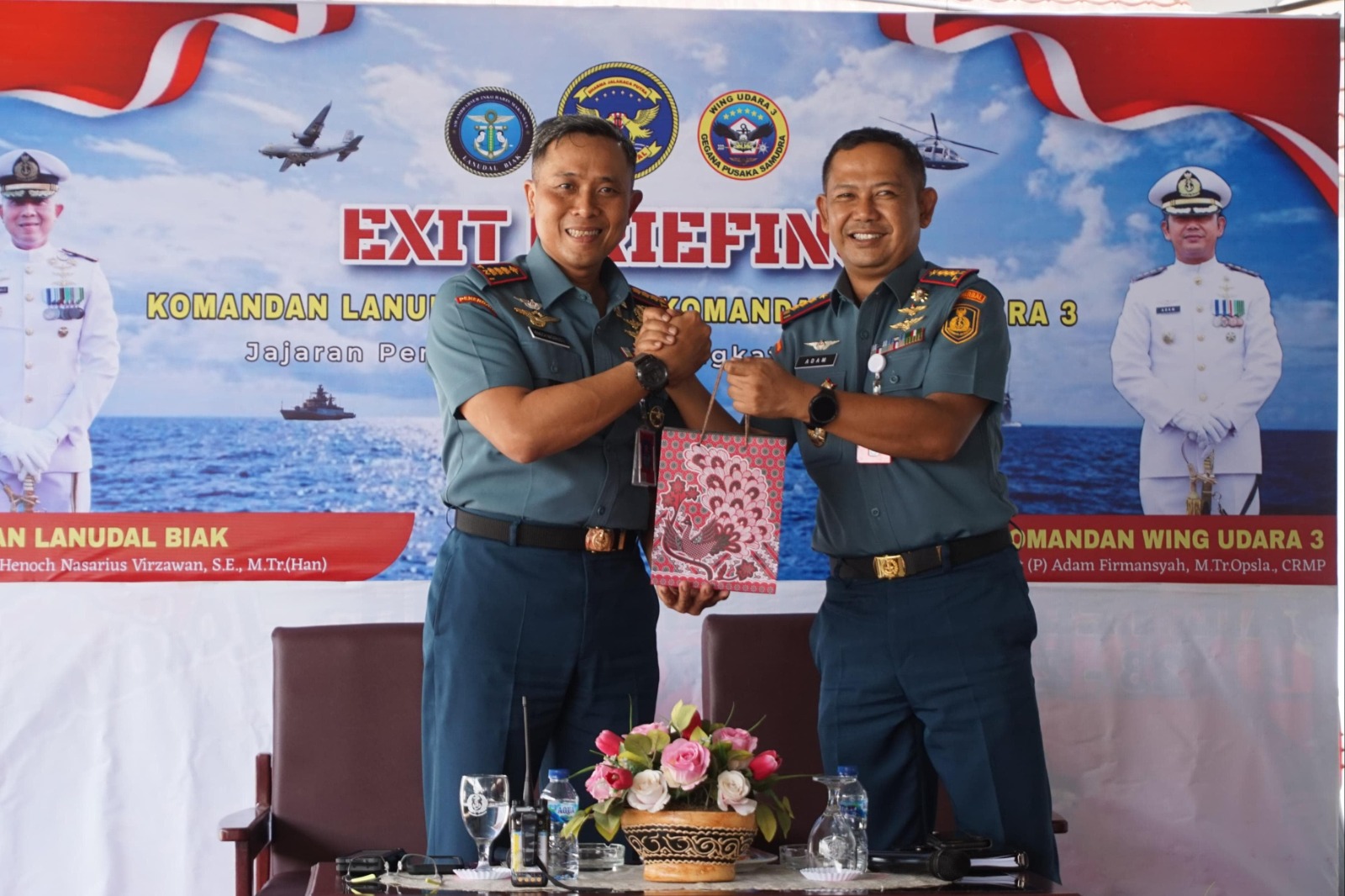 Dalam exit briefing tersebut, Danlanudal berpamitan juga bersama Danwing Udara 3, Kolonel Laut (P) Adam Firmansyah yang juga akan berganti jabatan, Danlanudal Biak melaksanakan Exit Briefing di hadapan seluruh personel jajaran Penerbangan TNI AL Biak.