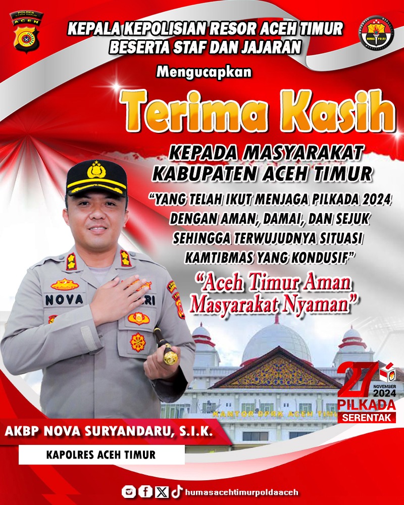 Tak lupa perwira dua melati dipundak itu, juga menyampaikan rasa terima kasih kepada personel Polres Aceh Timur, BKO Polda Aceh, BKO Brimob Kompi 4 Yon B Pelopor Sampoiniet dan seluruh Polsek jajaran dan yang menjaga pengamanan Pilkada 2024 hingga terciptanya situasi kamtibmas yang kondusif.