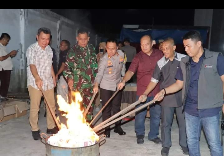 Kapolres Asahan AKBP Afdhal Junaidi, SIK, MM, MH menyaksikan langsung pemusnahan surat suara yang berlebihan pada Pemilihan Umum (Pemilu) 2024, di Gudang Logistik KPU Asahan, Selasa (13/02/2024).