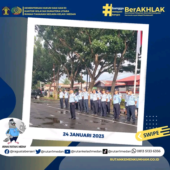 Pasca libur cuti bersama Tahun Baru Imlek 2023, Kepala Rutan Kelas I Medan Nimrot Sihotang Pimpin Apel Pagi di Lapangan Rutan Kelas I Medan, Selasa (23/01/2023).