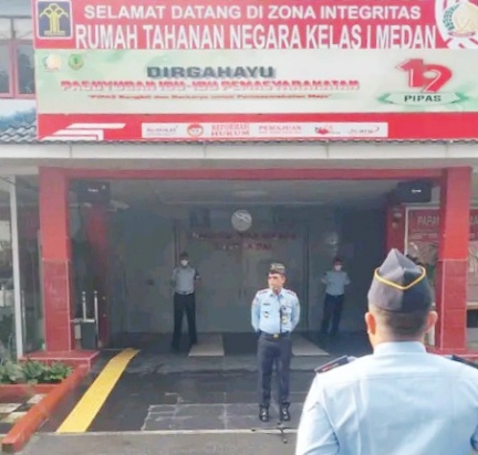 Pasca libur cuti bersama Tahun Baru Imlek 2023, Kepala Rutan Kelas I Medan Nimrot Sihotang Pimpin Apel Pagi di Lapangan Rutan Kelas I Medan, Selasa (23/01/2023).