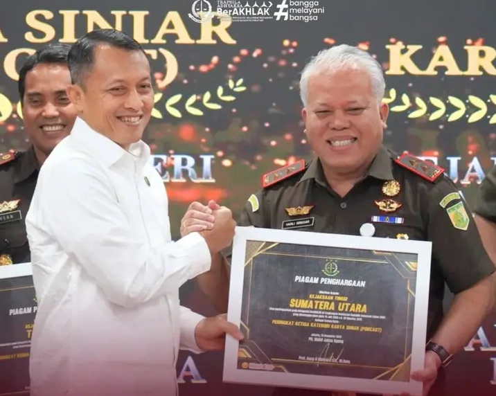 MEDAN I TambunPos.com – Kejaksaan Tinggi Sumatera Utara dianugerahi penghargaan dan apresiasi sebagai peringkat ke-III satuan kerja (Satker) kompetisi berAKHLAK tahun 2025 yang diserahkan oleh Wakil Jaksa Agung Republik Indonesia Prof.Dr.Asep N Mulyana diwakili Jaksa Agung Muda Pengawasan (JAMWAS) Prof Dr Rudi Margono dan diterima langsung oleh Kajati Sumatera Utara Dr.Harli Siregar, SH.,M.Hum di Jakarta pada hari Rabu 17/12/2025.