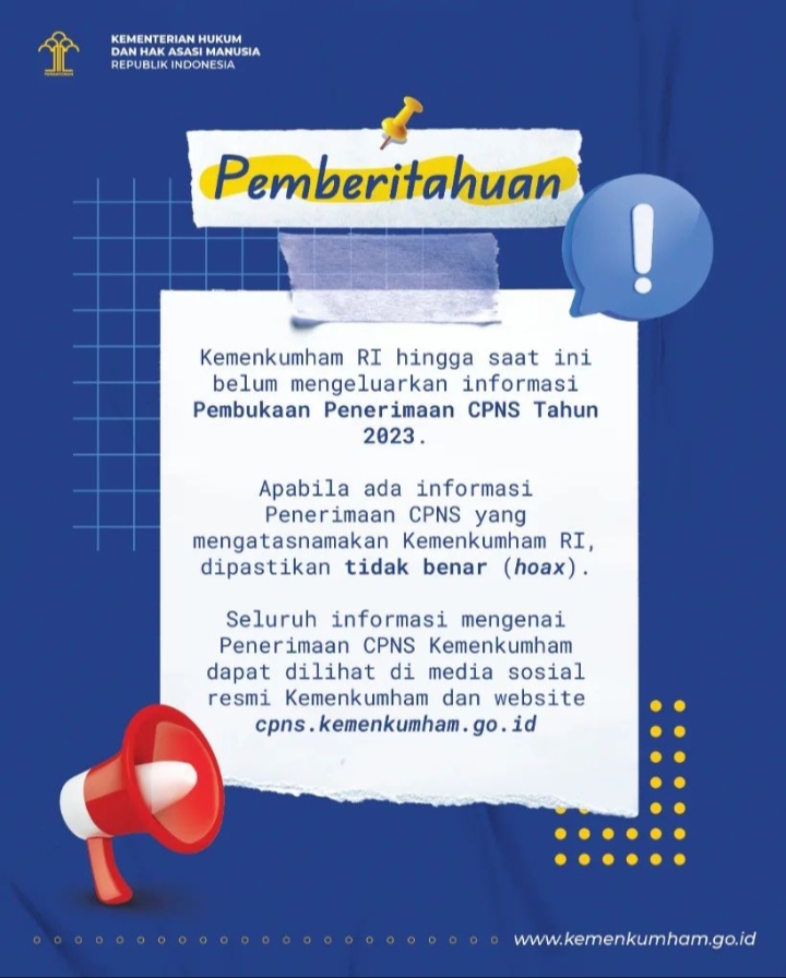 “Sekali lagi kami tegaskan, bahwa pengumuman resmi tentang penerimaan CPNS di lingkungan Kemenkumham Tahun 2023 hanya melalui situs cpns.kemenkumham.go.id, dan akun resmi media sosial,” tandas Hantor.