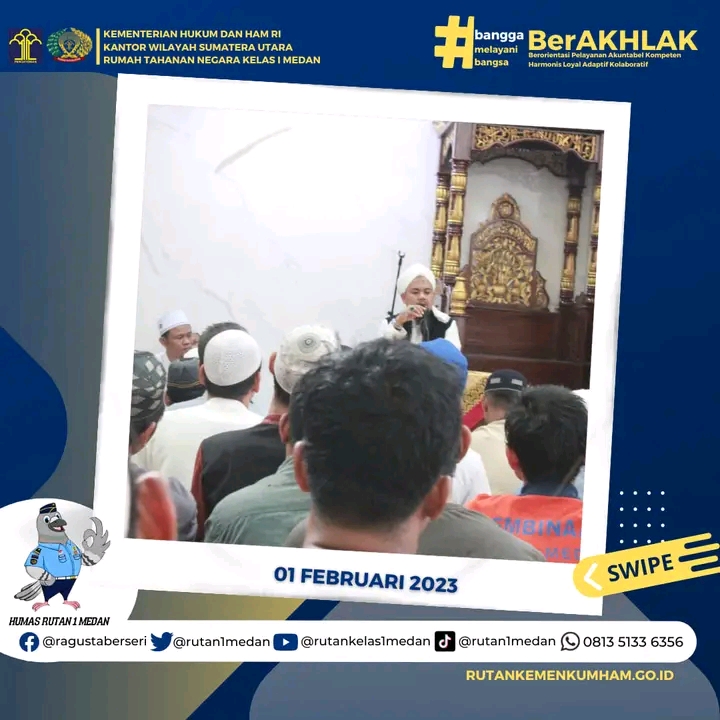 Dalam rangka safari dakwah di Lingkungan Kantor Wilayah Kemenkumham Sumatera Utara, KH Abdurrahman Al Banjari memberikan pembekalan Iman dan Amal Sholeh kepada Warga Binaan di Masjid At Taubah Rutan Kelas I Medan, Rabu (01/02/2023).