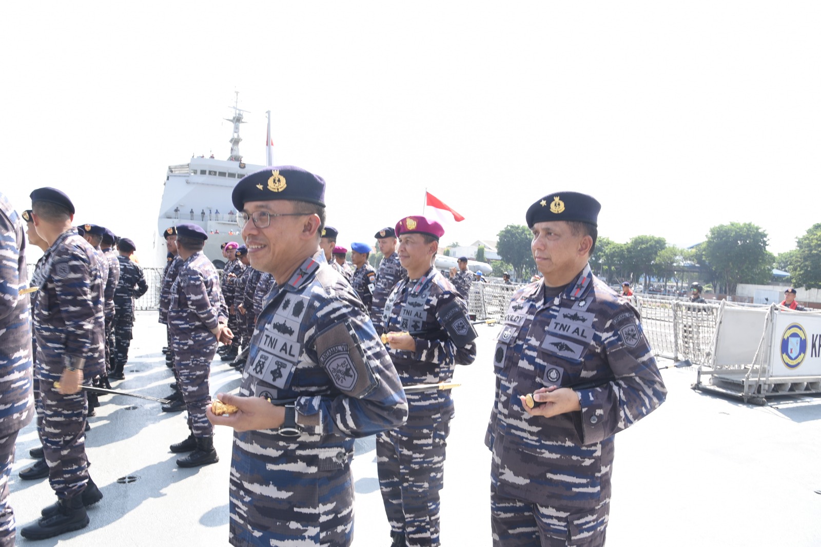 Komandan Lantamal VI (Danlantamal VI) Makassar Laksamana Pertama TNI Ivan Gatot Prijanto, S.E, M.Tr. Opsla. menghadiri acara inspeksi kapal perang (Admiral Inspection) dalam rangka Rangkaian Sertijab Pangkoarmada II, bertempat di Dermaga Madura Koarmada II Surabaya, Minggu (17/12/2023).