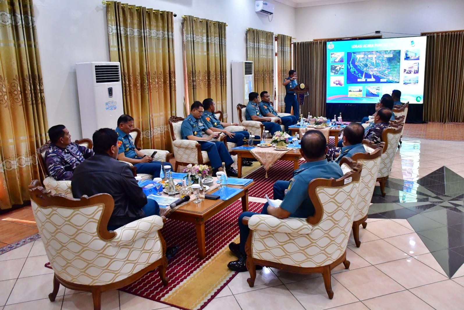 Komandan Pusat Penerbangan TNl Angkatan Laut (Danpuspenerbal) Laksda TNl Dr. Imam Musani mengikuti paparan Panitia Sail Cendrawasih 2023 kepada Kepala Staf TNl Angkatan Laut (Kasal) Laksamana TNl Dr. Muhammad Ali di Baseops Lanudal Juanda Puspenerbal, Juanda, Selasa (10/10/2023).