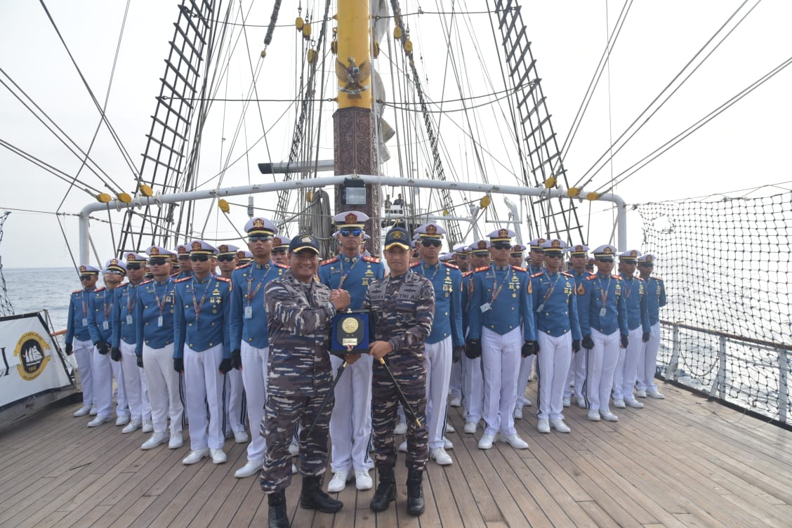 Dalam pelayaran dilaut Jawa Palaklat Mayor Laut (P) Rendra Hariwibowo mewakili Gubernur AAL Laksda Supardi menyerahkan Cinderamata kepada Komandan KRI Dewaruci Letkol Laut (P) Sugeng Hariyanto.