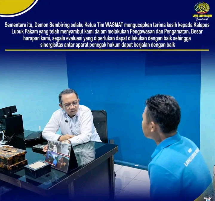 Sementara itu, Demon Sembiring selaku Ketua Tim WASMAT mengucapkan terima kasih kepada Kalapas Lubuk Pakam yang telah menyambut kami dalam melakukan Pengawasan dan Pengamatan. Besar harapan kami, segala evaluasi yang diperlukan dapat dilakukan dengan baik sehingga sinergisitas antar aparat penegak hukum dapat berjalan dengan baik. Dengan sinergisitas yang baik, niscaya para Tahanan maupun Narapidana dapat terlayani dengan baik,” tutup Demon.