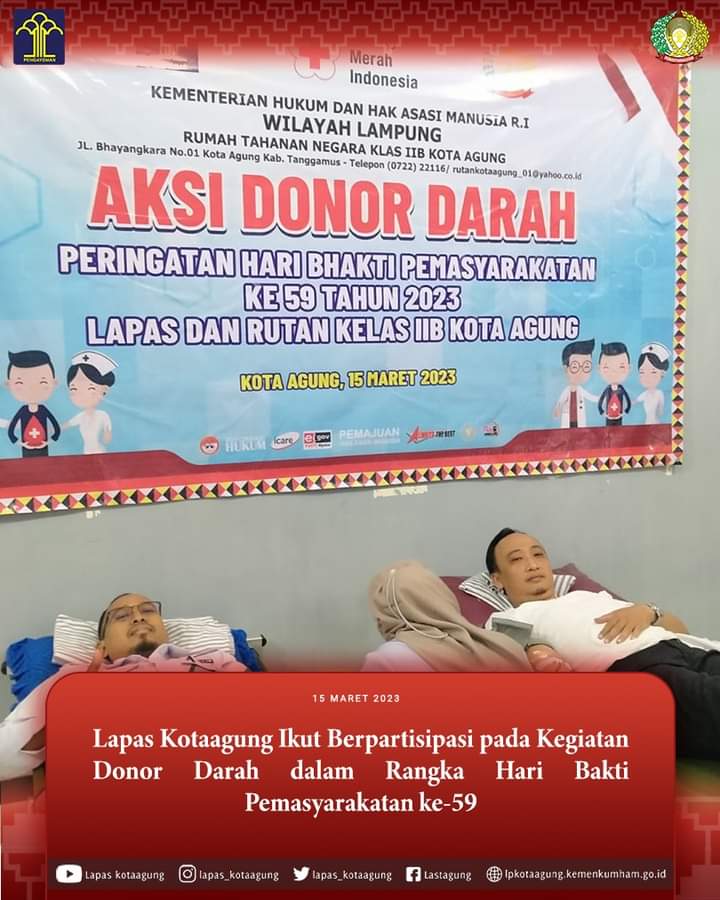 Lembaga Pemasyarakatan (Lapas) Kelas IIB Kotaagung bersama Rutan Kelas IIB Kotaagung menggelar kegiatan bakti sosial Donor Darah dalam rangka Hari Bakti Pemasyarakatan ke-59. Rabu ( 15-3-2023 )