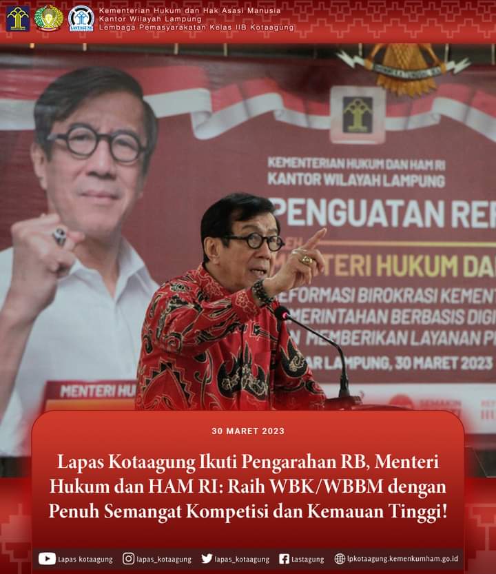 Lembaga Pemasyarakatan (Lapas) Kelas IIB Kotaagung mengikuti kegiatan pengarahan mengenai Reformasi Birokrasi (RB) dari Menteri Hukum dan Hak Asasi Manusia RI, Profesor Yasonna H. Laoly sekaligus penguatan pembangunan Zona Integritas (ZI) menuju WBK/WBBM oleh Staf Khusus (Stafsus) Menteri Hukum dan HAM RI bidang Keamanan & Intelijen, Krismono. Kamis( 30 – 3 – 2023 )
