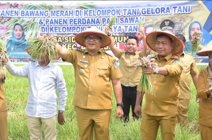 Usai panen bawang merah, Bupati dan Wakil Bupati melanjutkan dengan panen padi di lahan milik Poktan Jaya Tani di desa yang sama. Total luas lahan sawah Poktan Jaya Tani mencapai 70 hektare.