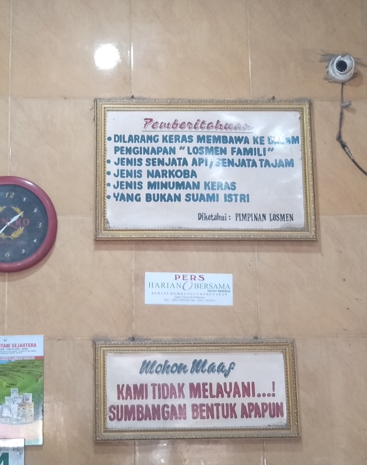 Pantauan awak media saat berada di lobi Losmen Family melihat tulisan pemberitahuan larangan itu memang ada yang di sangkutkan di dinding Losmen,dan itu hanya formalitas saja tidak dijalankan gimana semestinya.