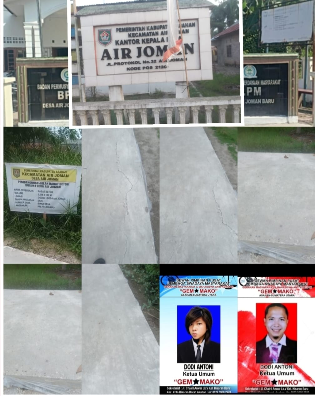 Asahan | Tambunpos.com — Dewan Pimpinan Pusat Lembaga Swadaya Masyarakat Gerakan Masyarakat dan Mahasiswa Anti Korupsi Kabupaten Asahan Provinsi Sumatera Utara Republik Indonesia (DPP LSM GEMMAKO ASAHAN SUMUT RI) kembali menyoroti anggaran dana desa di Desa Air Joman Kecamatan Air Joman Kabupaten Asahan, dengan nama pekerjaan Rabat Beton, Volume 2,5 M X 150 M, berlokasi di Dusun I, Tahun Anggaran 2025, Sumber Dana Desa, Anggaran Rp. 104.089.000. diduga asal jadi sudah tampak ada yang retak, kebanyakan pasir dan tanpa dasar tikar besi.