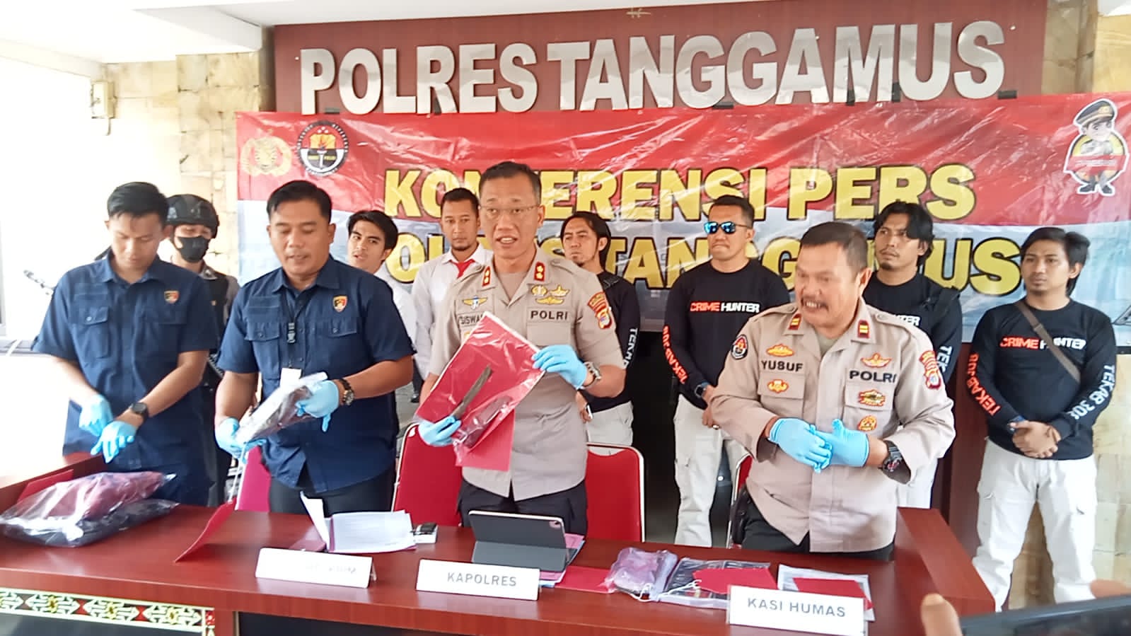 Tersangka ditampilkan dalam konferensi pers yang dipimpin Kapolres Tanggamus AKBP Siswara Hadi Chandra, S.I.K didampingi Kasat Reskrim Iptu Hendra Safuan, S.H., M.H dan Kasi Humas Iptu M. Yusuf, S.H., Senin 18 September 2023.