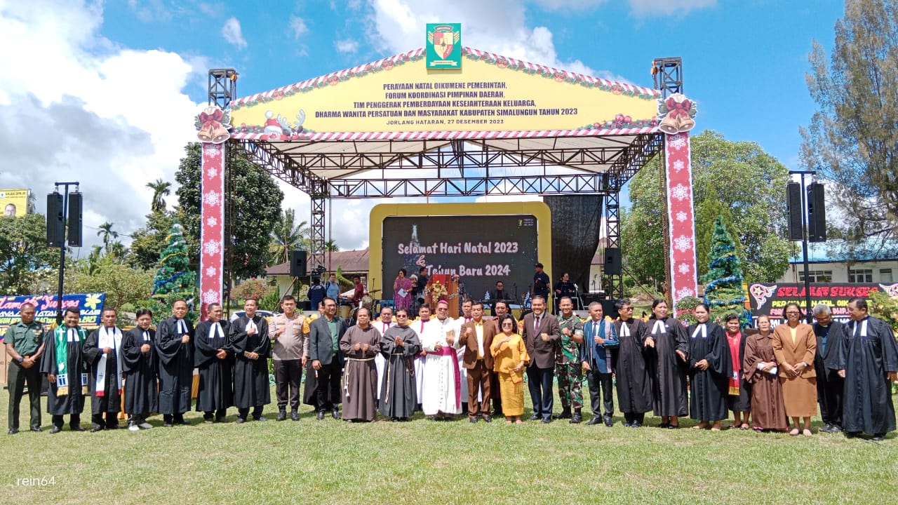 Perayaan Natal Oikumene bersama Forkopimda, TP-PKK, Dharma Wanita Persatuan (DWP) dan Masyarakat Kabupaten Simalungun Tahun 2023 berlangsung di lapangan SD Percontohan Tiga Balata, Kecamatan Jorlang Hataran, Simalungun, Sumut, Rabu (27/12/2023).