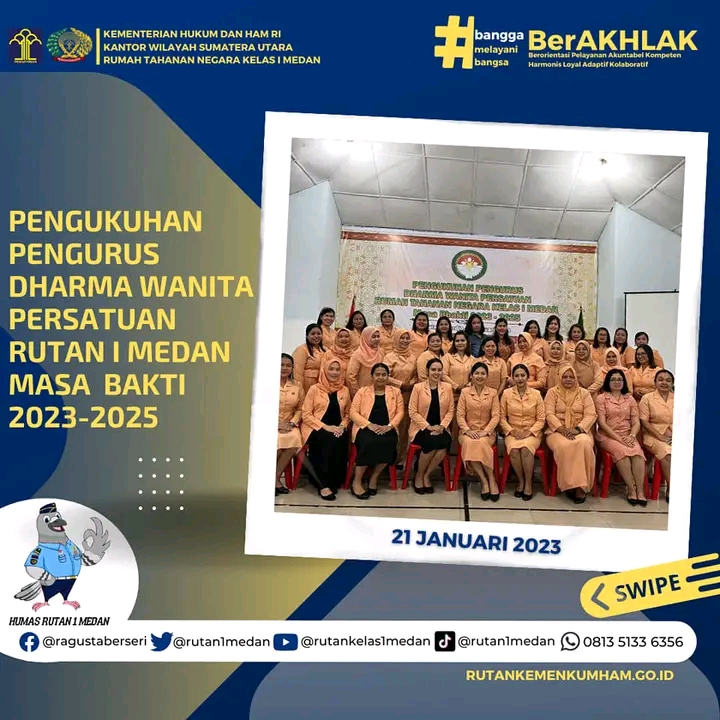 Hari ini Dharma Wanita Persatuan Rutan Kelas I Medan menyelenggarakan pengukuhan pengurus periode 2023-2025 yang di Ketuai oleh Ny Joan Nimrot, Sabtu (21/01/2023).
