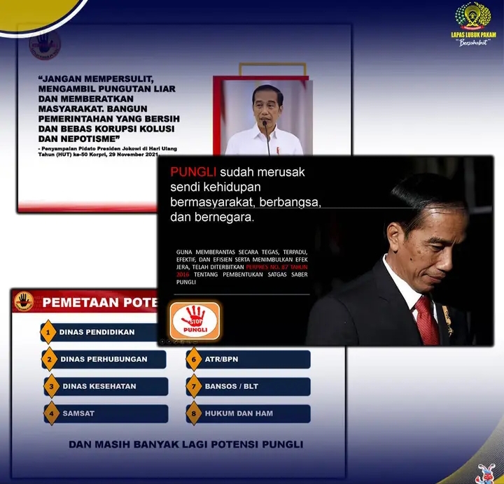 Dalam sambutannya, Erwedi Supriyatno selaku Plt. Dirkamtib Ditjen Pas mengucapkan terima kasih kepada seluruh Divisi Pemasyarakatan dan UPT Pemasyarakatan di seluruh Indonesia yang telah mengikuti kegiatan ini. Pungli sendiri adalah sebuah perilaku yang buruk yang disebabkan oleh gaya hidup yang kurang baik.