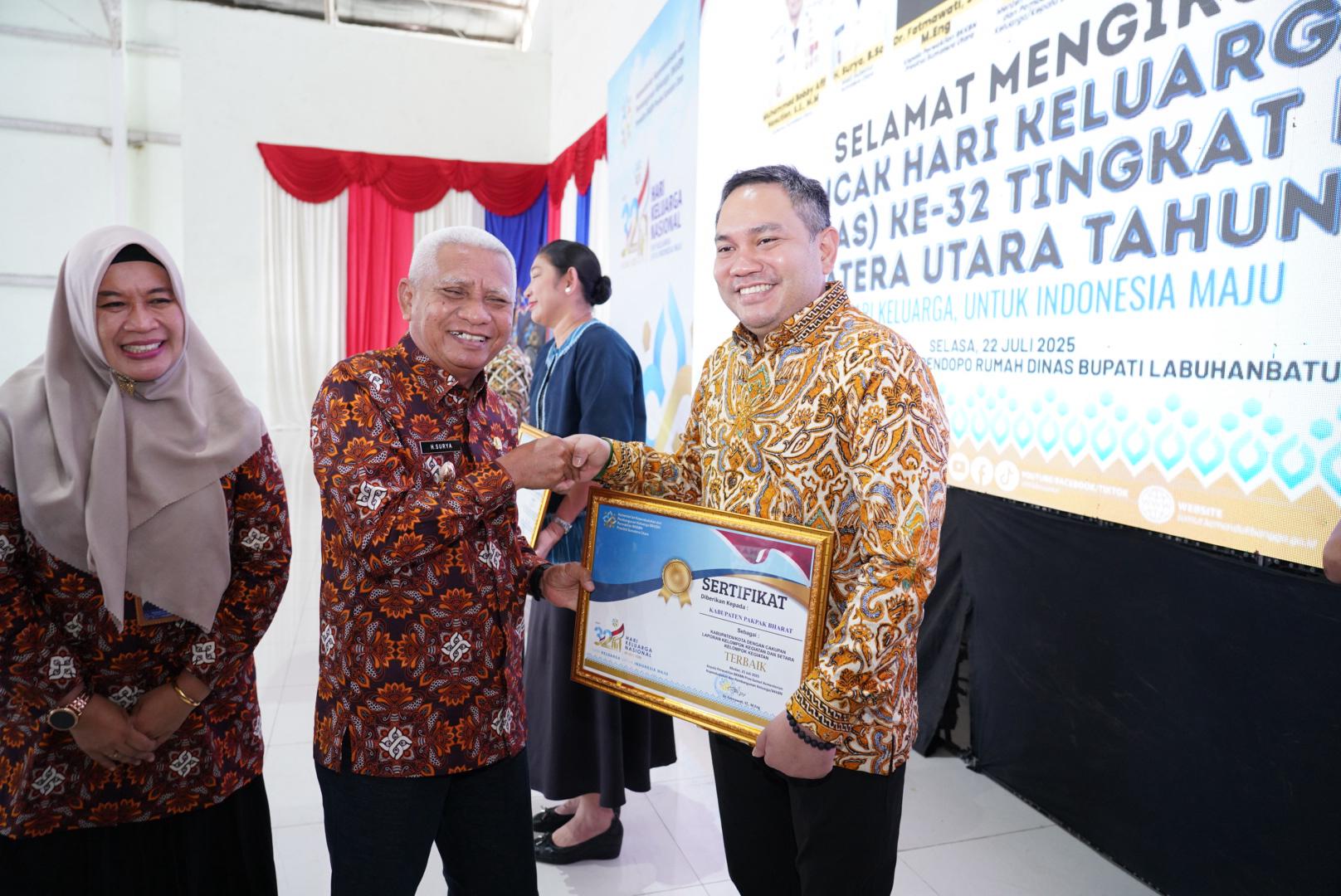 Penghargaan ini diberikan langsung oleh Wakil Gubernur Sumatera Utara, H. Surya, B.Sc, dalam acara Puncak Peringatan Hari Keluarga Nasional (Harganas) ke-32 Provinsi Sumatera Utara yang digelar di Kabupaten Labuhan Batu, (22/7)