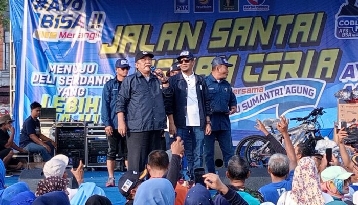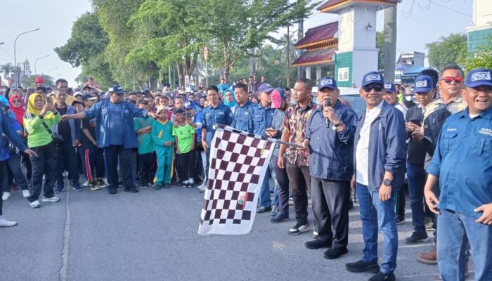 Ribuan masyarakat tumpah ruah memadati acara jalan santai dan Senam ceria yang digelar Relawan Pakam Bersatu di Lapangan Segitiga Lubuk Pakam, Minggu, (27/10/2024).
