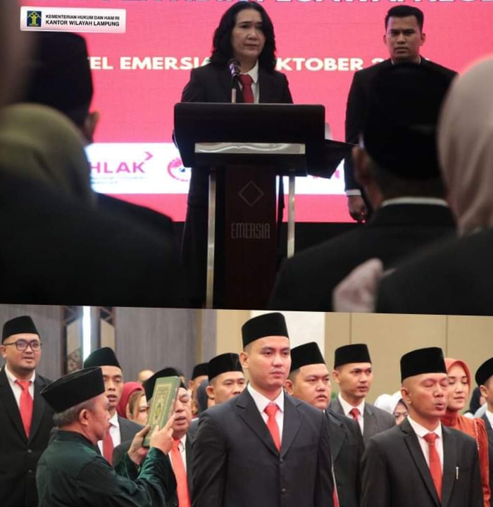 Bertempat di Ballroom Emersia Hotel, Kepala Kantor Wilayah Kementerian Hukum dan HAM Lampung, Dr. Sorta Delima Lumban Tobing melantik dan Mengambil Sumpah Jabatan Notaris Di Wilayah Provinsi Lampung, Pengganti Antar Waktu Anggota Majelis Pengawas Daerah Notaris Kabupaten Lampung Selatan dan Penyidik Pegawai Negeri Sipil Kabupaten Mesuji. Kamis, (19/10/2023).
