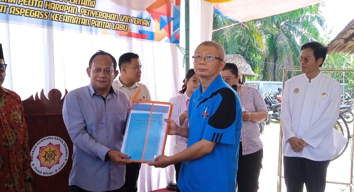 Ket foto : Sekda Deli Serdang, Dedi Maswardy SSos MAP serahkan Izin Ternak pada Peresmian Sekretariat Aspegass di Desa Paluh Sibaji, Kecamatan Pantai Labu, Minggu (11/1/2026).