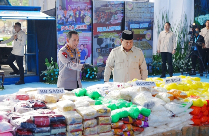 Presiden Republik Indonesia, Jenderal TNI (Purn) H Prabowo Subianto memimpin dan menyaksikan langsung pemusnahan barang bukti narkoba dengan total berat 214,84 ton senilai Rp29,37 triliun yang digelar di Lapangan Bhayangkara Mabes Polri, Jakarta Selatan, Rabu (29/10/2025).