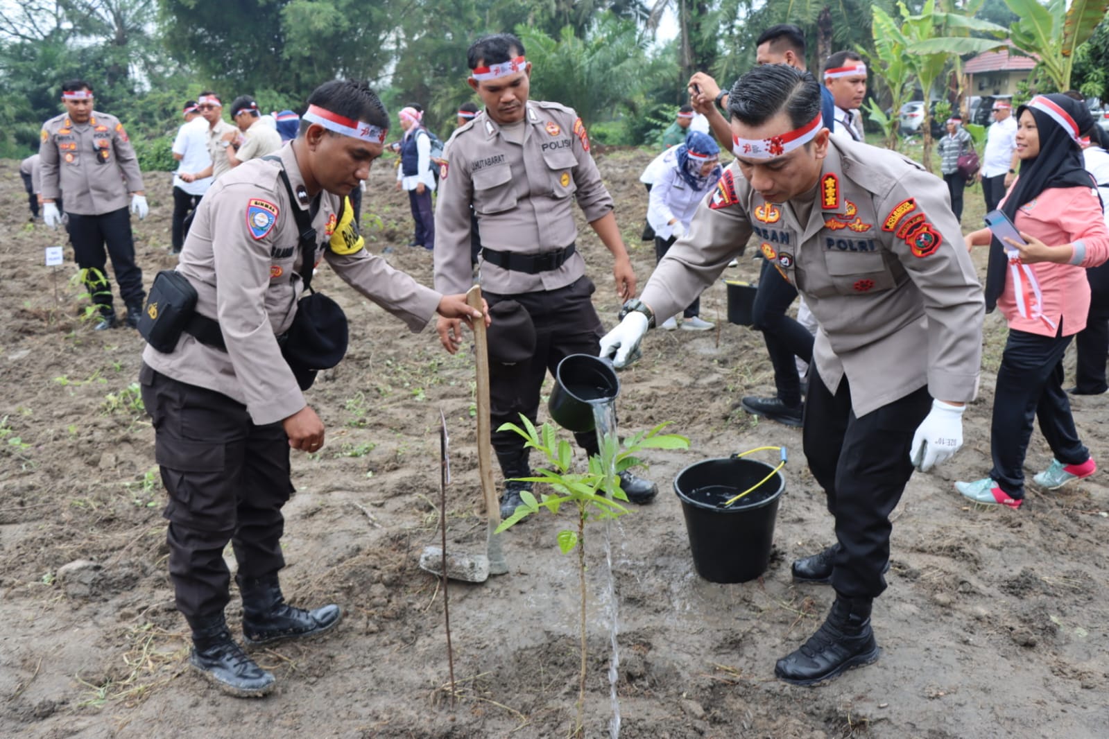 Untuk Jajaran Polresta Deli Serdang melaksanakan penanaman sejumlah 2.400 pohon yang diawali oleh Kapolresta Deli Serdang Kombes Pol Irsan Sinuhaji, SIK, MH, bersama Ketua Bhayangkari Cabang Kota Deli Serdang Ny. Novi Irsan Sinuhaji.di halaman belakang Mapolsek Pagar Merbau Polresta Deli Serdang, Rabu (23/8/2023).