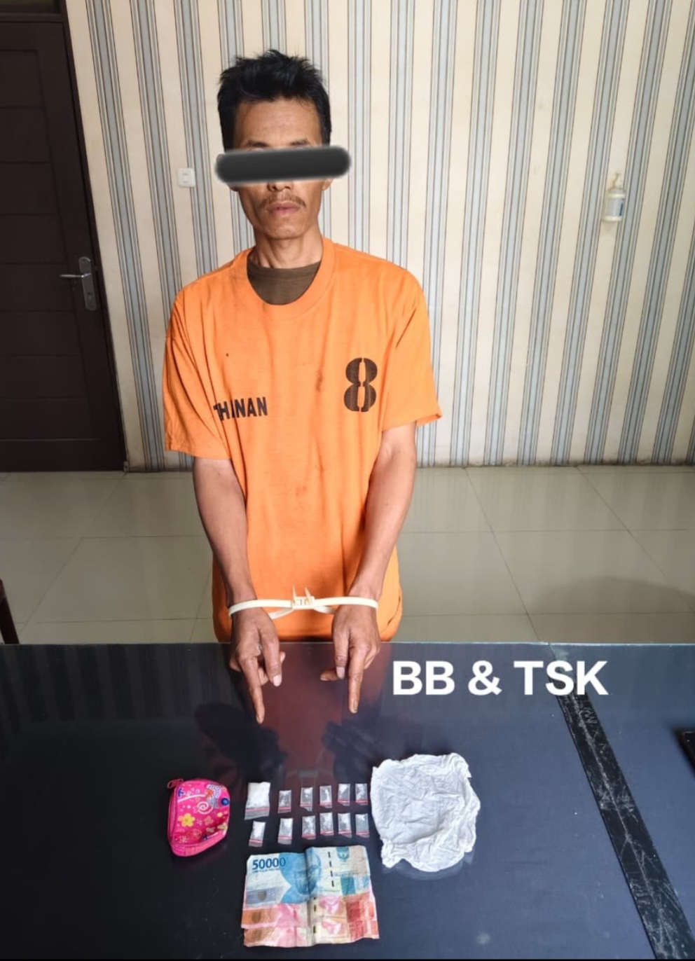 Tersangka inisial PEM(43), seorang petani warga Desa Pengambaten, Kecamatan Merek, diamankan langsung di rumahnya. Dalam penggeledahan yang dilakukan petugas, ditemukan 12 paket narkotika jenis sabu dengan berat total 4,11 gram, satu lembar tisu, sebuah dompet warna pink, serta uang tunai senilai Rp 250.000.