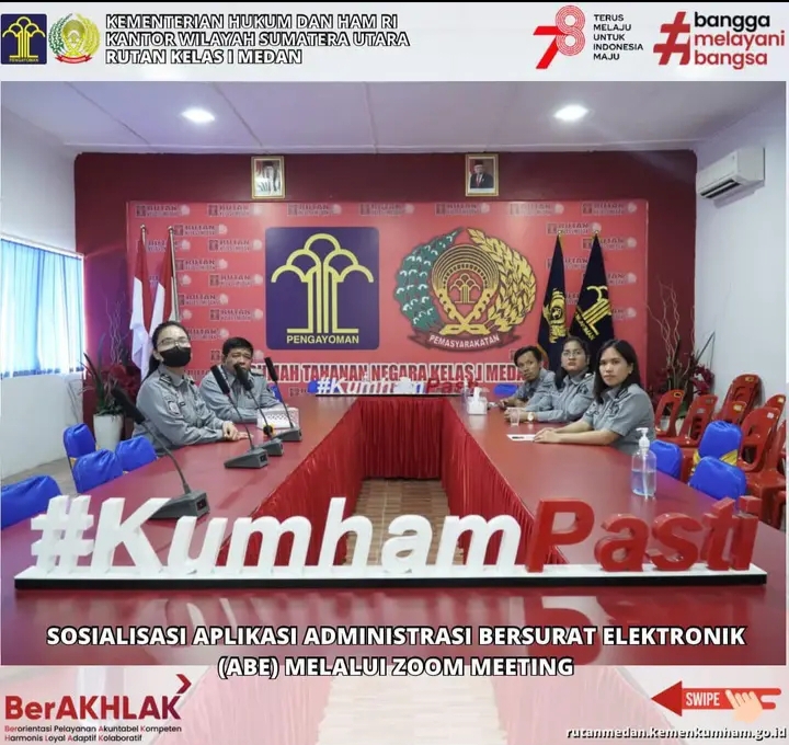 Rutan Kelas I Medan Kanwil Kemenkumham Sumut mengikuti sosialisasi Aplikasi Administrasi Bersurat Elektronik (ABE) Melalui Zoom Meeting. Bertempat di Aula Muladi kegiatan ini diikuti oleh Kasubsi Urusan Tata Usaha Andarias Barus dan Staff.