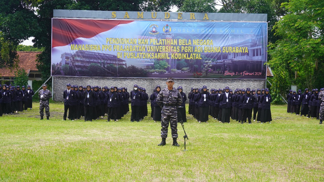 Sebanyak 472 Mahasiswa Pendidikan Profesi Guru (PPG) Prajabatan Universitas PGRI Adi Buana Surabaya yang terdiri dari 126 peserta pria dan 346 peserta Wanita mengikuti Pendidikan dan Pelatihan Bela Negara di Puslatdiksarmil Kodiklatal mulai tanggal 3 sampai dengan 4 Februari 2024, bertempat Lapangan Samudera Puslatdiksarmil, Juanda Sidoarjo. Sabtu, (03/02/2024).