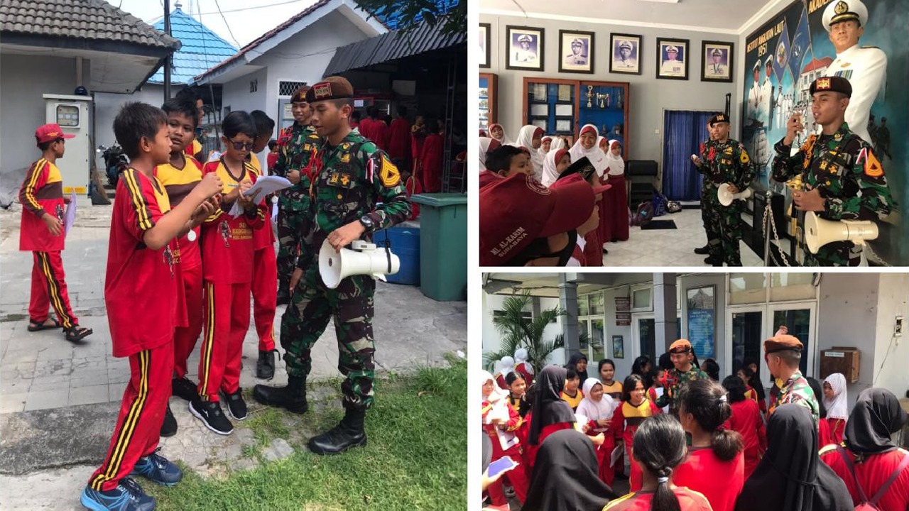 Taruna Akademi TNI Angkatan Laut (AAL) Tingkat IV Korps Teknik Angkatan ke-69 beserta Dosen Prodi Teknik Mesin Kapal Perang Akademi Angkatan Laut melaksanakan Pengenalan Sejarah Keangkatan Lautan kepada siswa SMP Luar Biasa Surabaya Karya Mulya, SDN Mojo Sulur Mojokerto dan SD Islami Dewi Masyitoh Gondang Legi Malang saat mereka berkunjung di Museum Loka Jala Crana, AAL Bumimoro, Surabaya, Rabu (22/11).