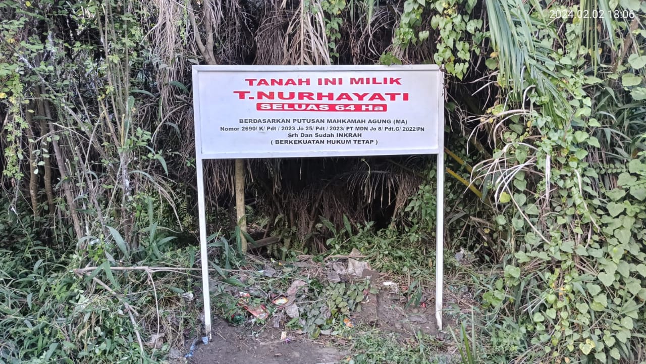 Tulisan yang tertera di plang Kepemilikan tanah 64HA berdasarkan Putusan Mahkamah Agung no 2690 K / Pdt 2023. perkara perdata Tengku Nurhayati (64) terhadap Hariantono, Tjang Jok Tjing, dan Bunju, warga Desa Kota Galuh, Kecamatan Perbaungan, Serdang Bedagai tertanggal 24 Oktober 2023 oleh Dr Yakup Ginting SH CN M.kn dan Dr Nani Indrawati SH M. Hum Dr Drs Muh. Yunus Wahab SH MH memutuskan.